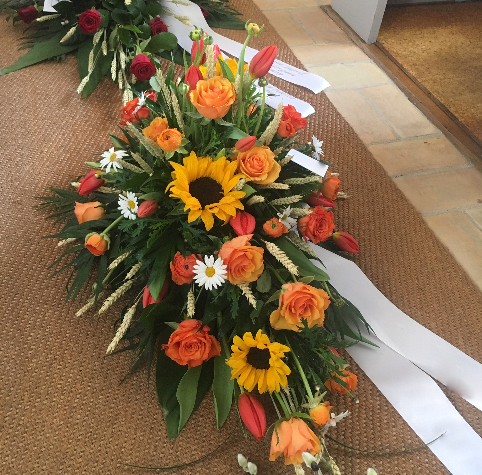 Båredekorationen er en flot opsats lavet i oasis, som tager sig smukt ud på kirkegulvet.