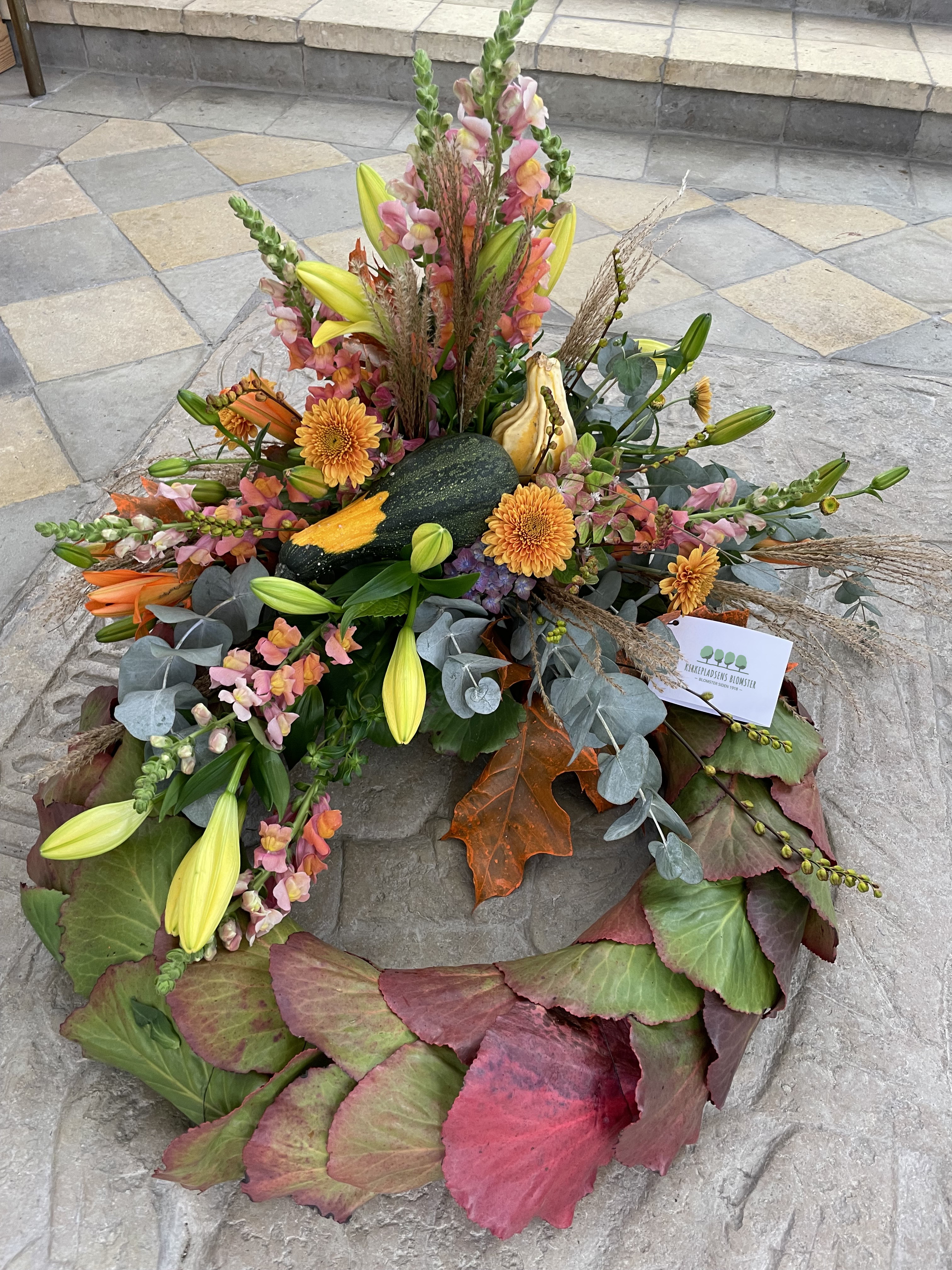 Smuk grøn krans med blomsterdekoration i afstemte farver. Den viste farvekombination er blot til inspiration. Du skal blot vælge den farvekombination du ønsker, eller lade os vælge en smuk blomster sammensætning